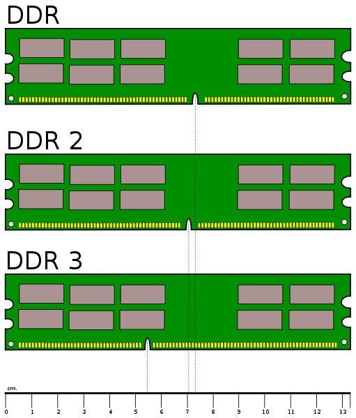 Рисунок 1‑9. Модули памяти DDR SDRAM различных поколений физически не совместимы между собой (Источник: http://en.wikipedia.org/wiki/File:Desktop_DDR_Memory_Comparison.svg)