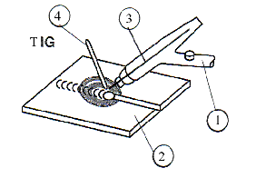 1. Keevituspõleti – сварочная горелка 2. Põhimetall – основной металл 3. Volframelektrood – вольфрамовый электрод 4. Lisamaterjal – присадочный материал |